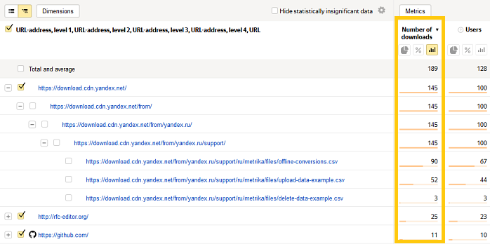 此报表显示用户尝试从您的网站下载音频和视频材料、存档、图像和其他文件的次数。 请注意,某些下载可能尚未完成。
