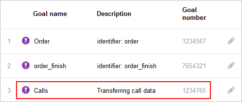 In Yandex Metrica, calls are tracked using goals. The first time data is transmitted from the call tracker, a special goal is created. It’s displayed on the Goals page in the left menu in Yandex Metrica. Names and descriptions of goals can be undefined (indicated data is sent through the API).