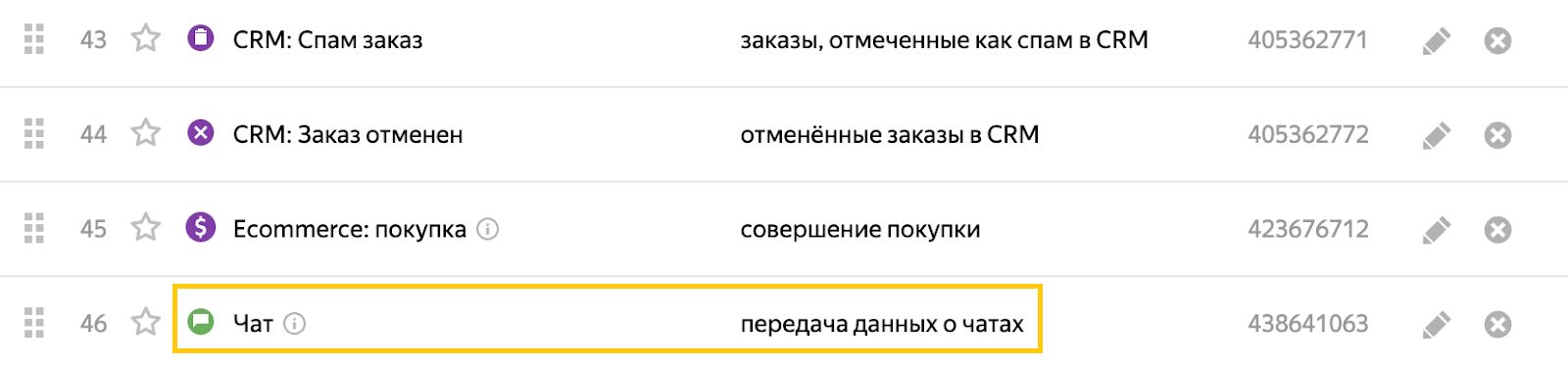 Yandex Metrica tracks chats using goals: when you upload chat conversion data for the first time, the service automatically creates a special Chat goal. This auto-goal then appears on the goal management page in the Yandex Metrica interface.