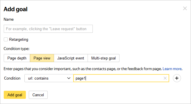 为避免因网站上的相似 URL 重叠而导致目标被意外触发,请不要使用过于简短的条件。 例如,如果目标条件指定了包含 cart 的 URL,且网站域名为 bestcartoons.ru,则当用户查看该网站的任意页面时,即视为达成目标。