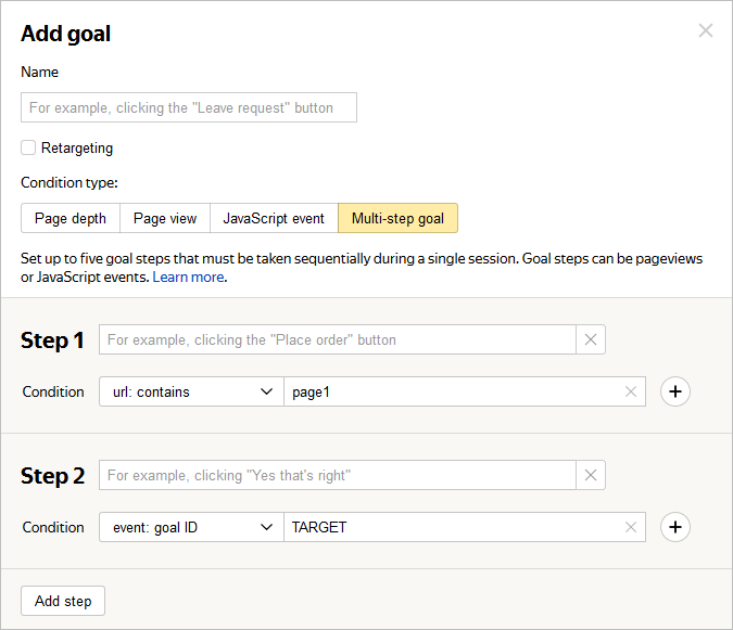 多步骤目标中的事件是通过 JavaScript 传输到 Yandex Metrica 的事件。 创建目标包括指定其标识符。 当目标完成后,调用 reachGoal 方法,并将指定的 ID 传递给它。