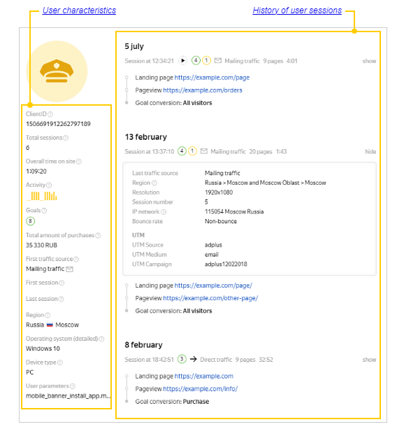 Yandex Metrica 收集有关网站上用户会话的非个性化信息。 该服务通过另存为 cookie 的匿名浏览器 ID 来跟踪用户。 此报表包含一个列表,其中列出访问过您网站的用户以及他们在网站上的会话和操作的历史记录。