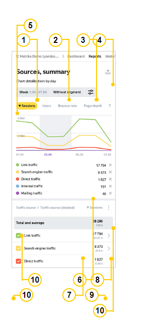 Mobile Yandex Metrica tools are as similar as possible to the tools in the desktop version, but there are some differences when viewing statistics.