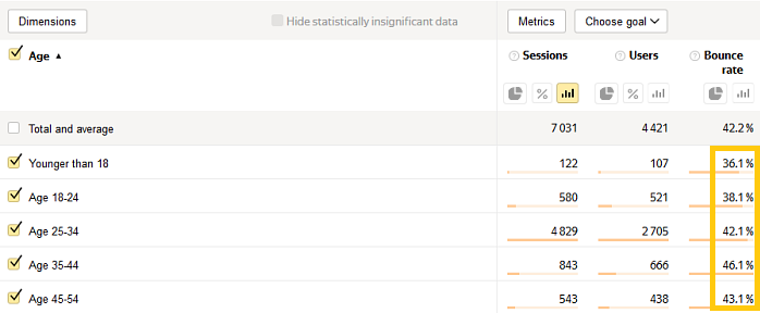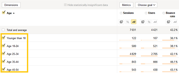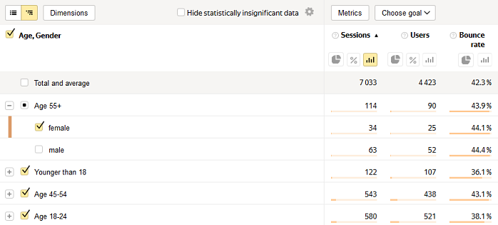 关于用户主要社会人口特征的报告基于通过 Crypta 技术获得的数据。 由于这种技术的应用方式不同,导致报表中显示的会话数可能会比服务中的其他报表少。