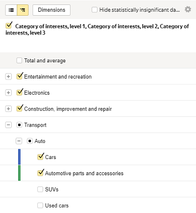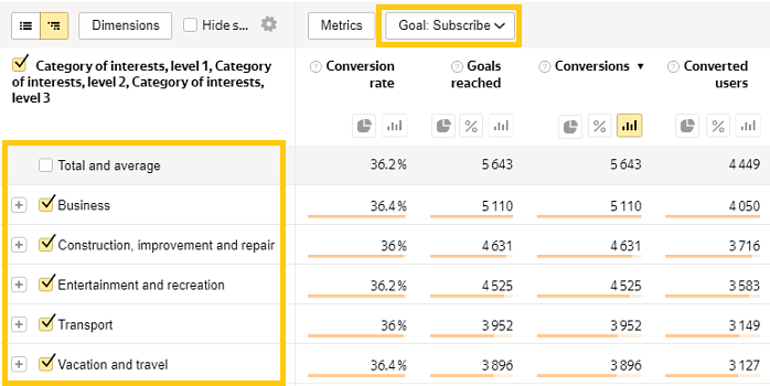 在将 affinity index 指标添加到另一个 Yandex Metrica 报表之前,请先向该报表添加 Categories of interests 维度。 如果没有此分组,则该指标不可用。