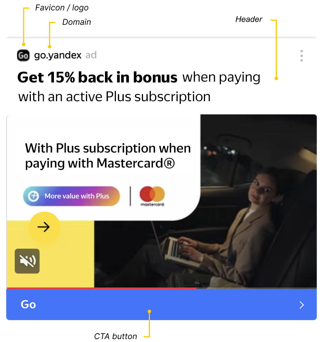 A video ad unit may contain additional elements defined by the advertiser: a header, a logo, a CTA button, a domain, or text. They help increase the unit conversion rate.