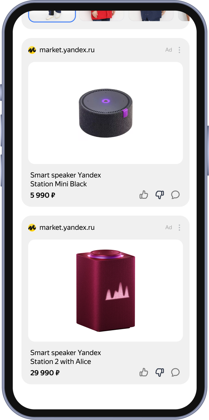 For this ad unit type, Yandex has developed special algorithms that select the most visually attractive ads, motivating the user to look through the feed and follow the ad links. The feed displays several product ads at a time, which is one of the reasons it may be more effective than other ad formats.