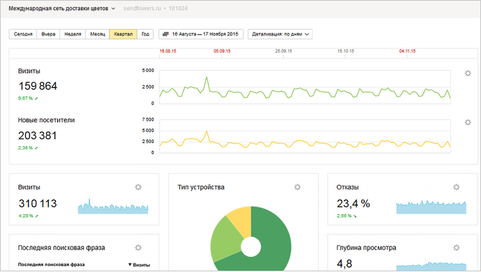 Сводка — это главная страница вашей Метрики, которая дает возможность быстро получить информацию о трафике и другие важные показатели.