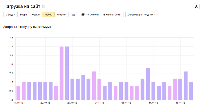 Отчеты меню Стандартные отчеты → Мониторинг позволяют отслеживать доступность сайта, нагрузку на него в режиме реального времени, среднее время загрузки страниц и количество посетивших сайт роботов.