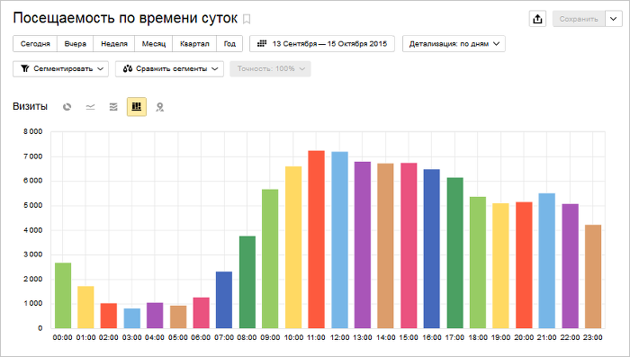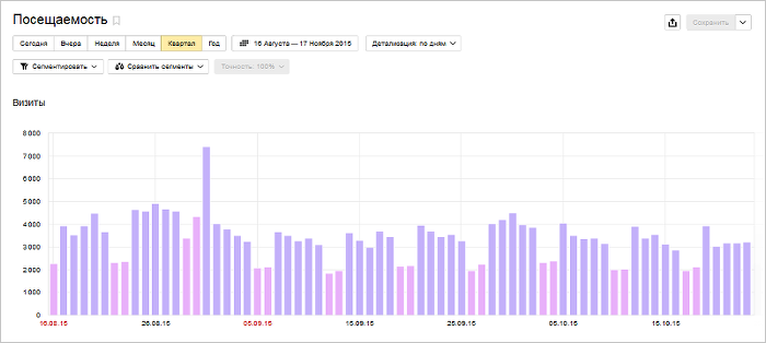 Отчет Стандартные отчеты → Посещаемость показывает уровень трафика за любой необходимый отрезок времени.