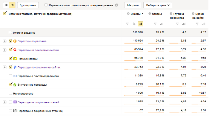 Для оценки качества трафика необходимо понимать, откуда он пришел. Это можно посмотреть в отчетах из меню Стандартные отчеты → Источники, например, Сайты, Поисковые фразы или Социальные сети.