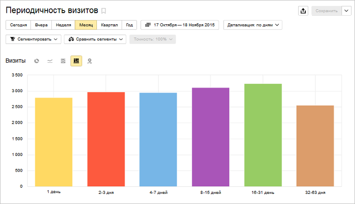 Отчеты блока Лояльность позволяют оценить количество визитов одного посетителя, периодичность визитов, интервал времени между двумя последними визитами и интервал времени между самым первым и последним визитом пользователя.