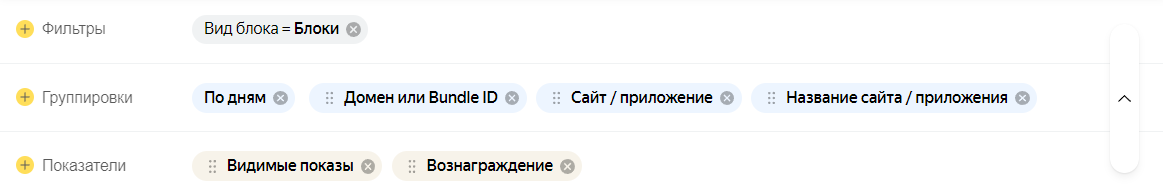 Например, чтобы посмотреть, какие приложения приносят наибольший доход, можно сгруппировать данные по домену, ID и названию приложения. Добавьте соответствующие группировки: Домен или Bundle ID, Сайт / приложение, Название сайта / приложения.