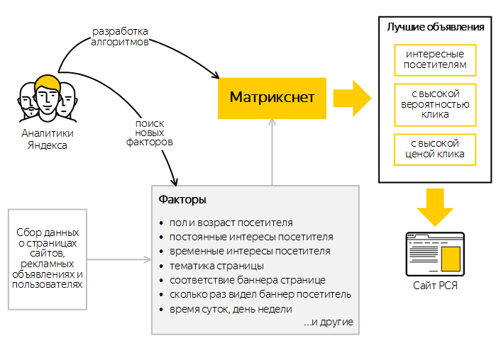 Мы всегда стараемся дать пользователю наиболее точный ответ, в том числе и в рекламе. Матрикснет позволяет расширить количество факторов, которые мы учитываем при показе объявлений в Рекламной сети, так что объявления все больше соответствуют как интересам пользователей, так и целям рекламодателей и владельцев сайтов.
