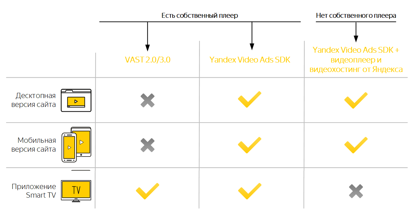 Технология Yandex Video Ads SDK позволяет встраивать видеорекламу в контент на сайтах партнеров Рекламной сети Яндекса. Это библиотека, которая интегрируется в видеоплеер и отображает рекламный ролик, обеспечивая поддержку стандартов VAST/VPAID. В качестве видеоплеера может выступать плеер Яндекса или любой сторонний плеер.
