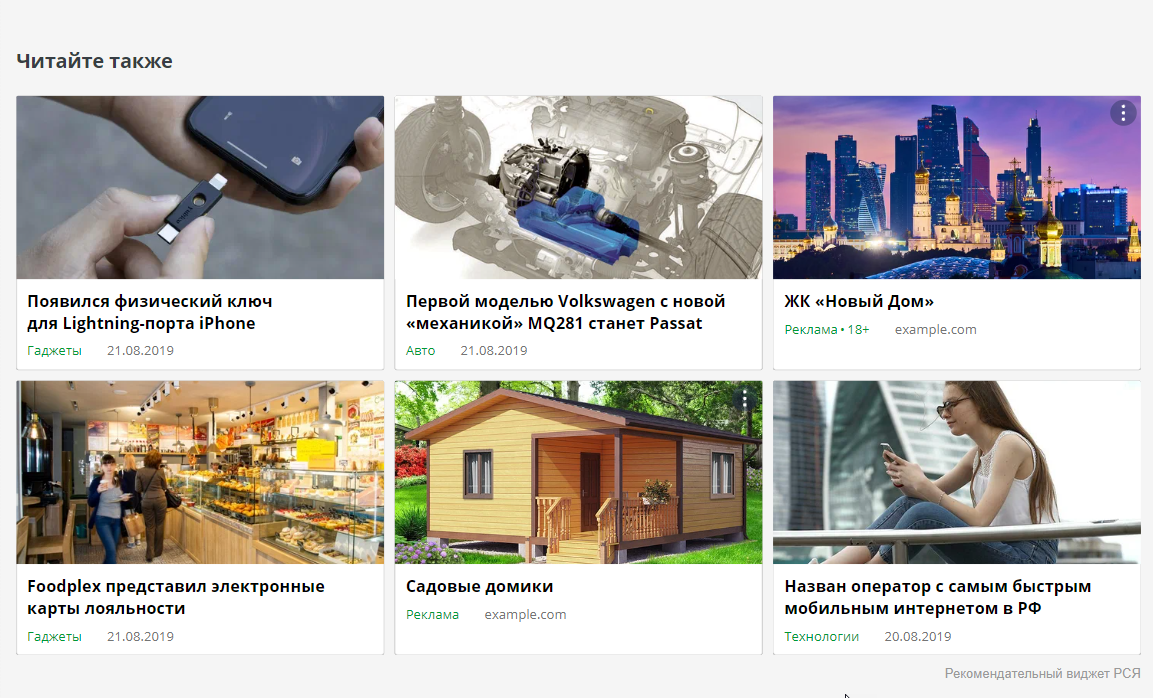 Рекомендательный виджет — это блок на тематической странице, в котором можно размещать рекламу и ссылки на публикации своих сайтов. Рекомендательный виджет доступен для десктопной и мобильной версии сайта.