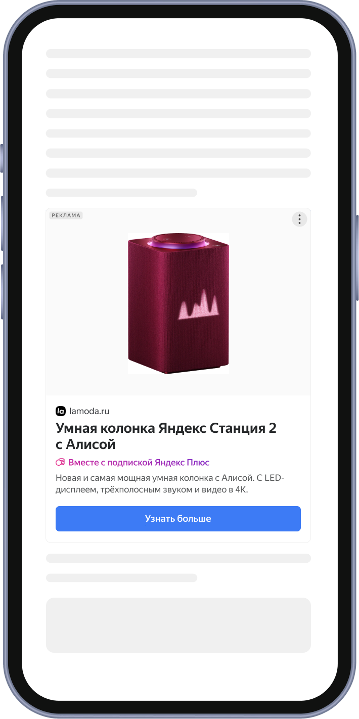 текстово-графические объявления формата Адаптивный. Дизайн текстово-графических объявлений формируется автоматически по технологии Smart Design. Технология определяет, какое объявление с большей вероятностью привлечет внимание пользователя, и собирает его из доступных дополнений.