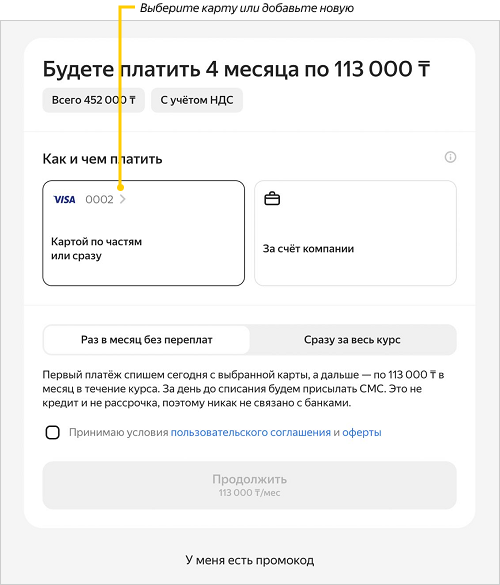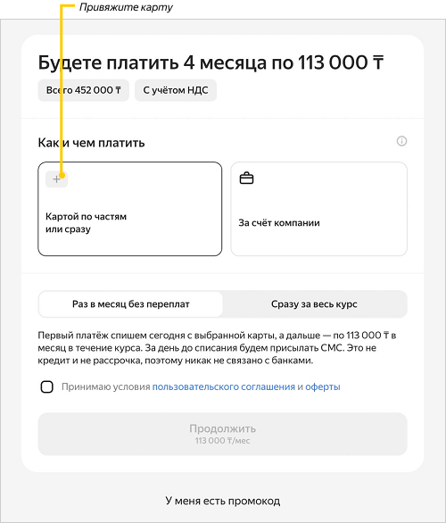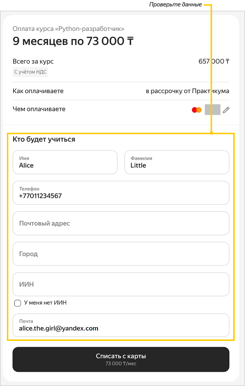 3.5. Нажмите кнопку Списать с карты. В зависимости от способа оплаты с карты спишется либо полная стоимость курса с учетом скидки, либо платеж за первый месяц курса. При частичной оплате списания будут производиться ежемесячно равными долями до конца курса.