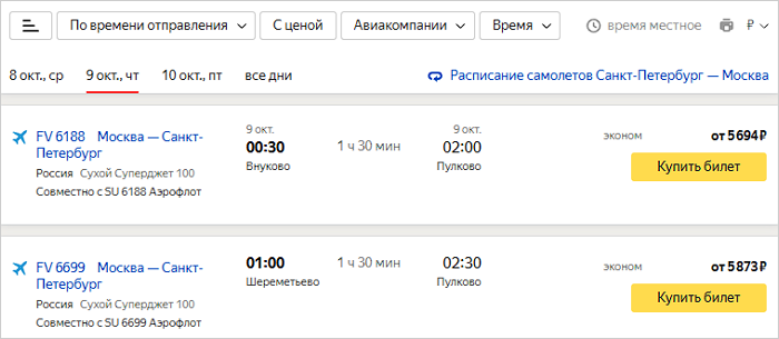 На Яндекс Расписаниях можно посмотреть расписание рейсов популярных авиалиний.