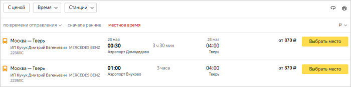 - отфильтровать — выбрать время отправления или прибытия, показать только с ценой и уточнить станцию для маршрутов без пересадок;
