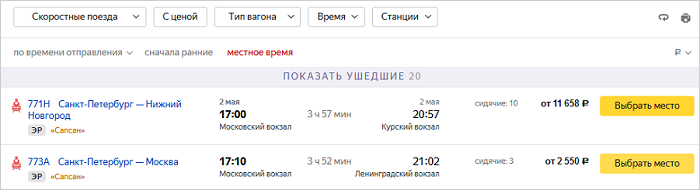- отфильтровать — показать только скоростные поезда и с ценой, выбрать тип вагона, уточнить интервал отправления или прибытия и выбрать станцию отправления или прибытия;