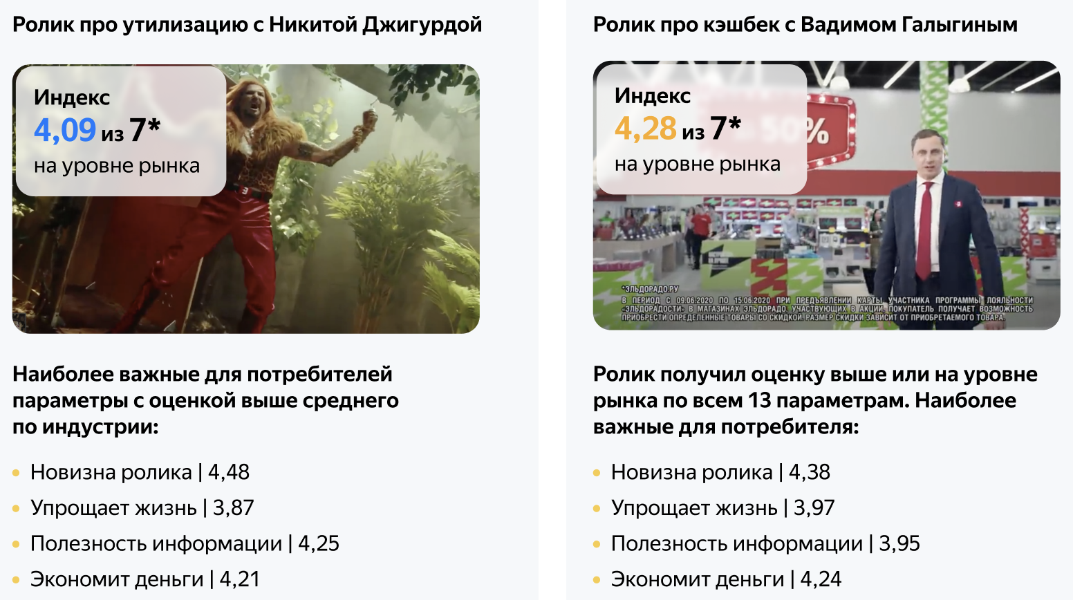 Ролики протестировали с помощью Яндекс Взгляда. Исследование показало, что пользователи хорошо оценили рекламу. Ролик с Никитой Джигурдой оценили на уровне рынка — 4,09, а реклама с Вадимом Галыгиным получила оценку выше рынка — 4,28. В обоих случаях респонденты отмечали, что ролики полезные и отличаются новизной, а рекламируемый продукт упрощает жизнь и экономит деньги. По данным Яндекс Взгляда, полезность и новизна — одни из главных критериев качественного креатива в индустрии ретейла.