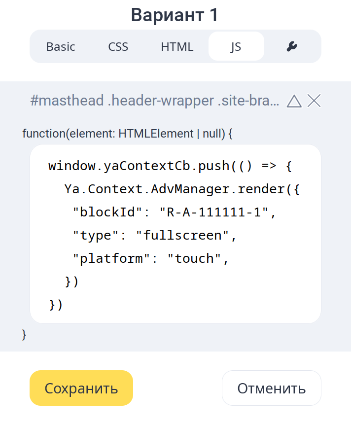 В этом случае на всех страницах, где есть выбранный вами элемент, появится рекламный контейнер и вызовется код со вкладки JS.