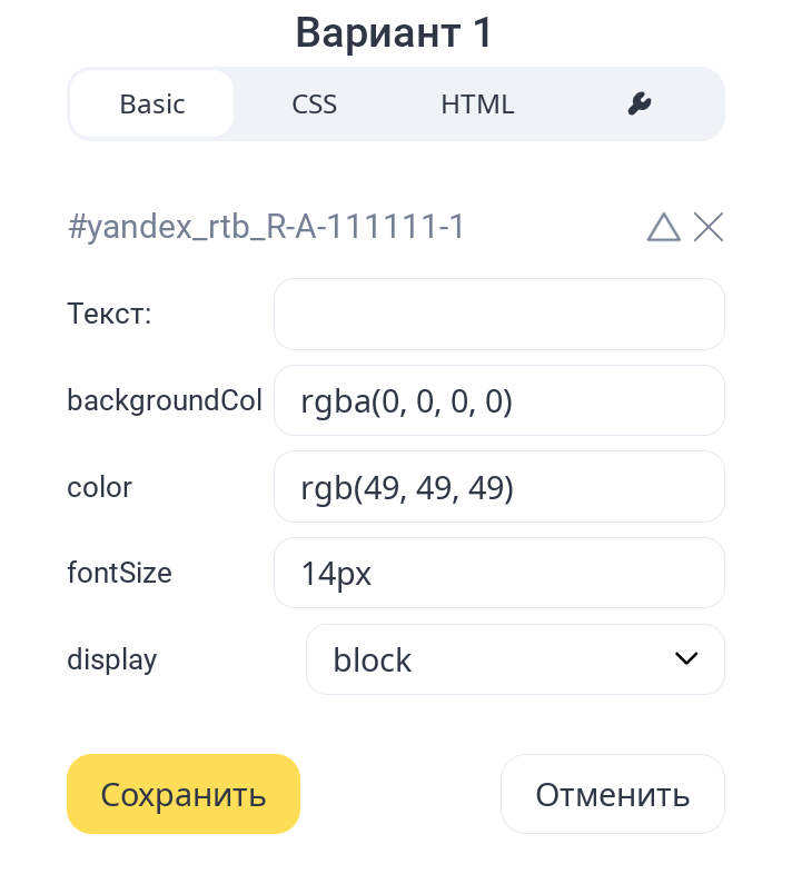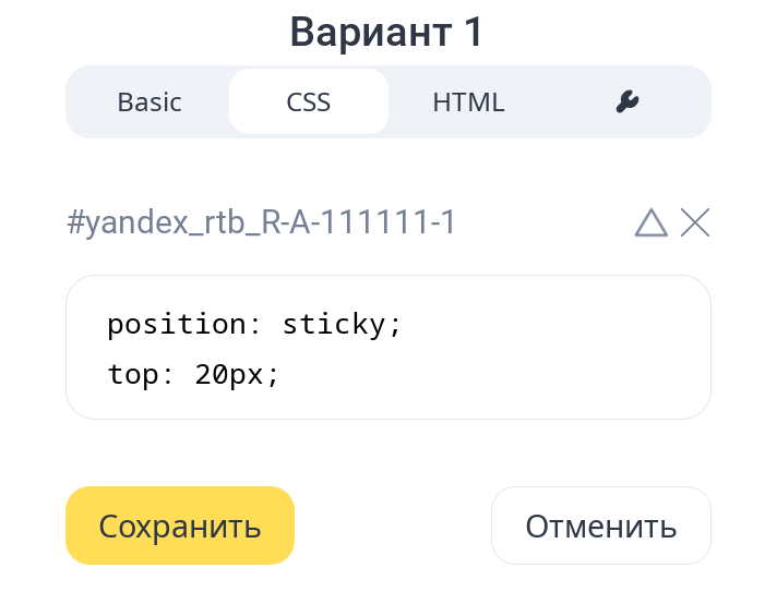 Редактор встраивается в ваш сайт и позволяет менять способ отображения рекламного блока и его размер. Все изменения применяются в реальном времени. После сохранения изменений и запуска эксперимента правки, которые вы сделали в редакторе, будут видны посетителям сайта, попавшим в эксперимент.