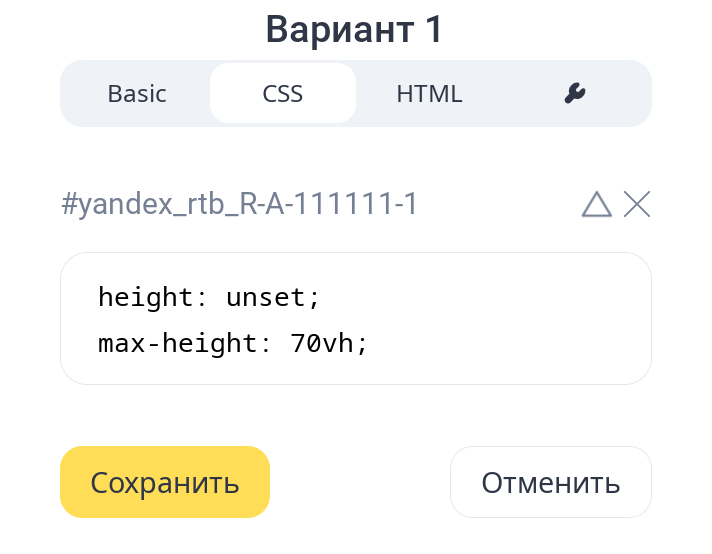 Также с помощью визуального редактора вы можете добавить код вставки рекламного блока. Это может быть полезно при проведении тестов с новыми рекламными местами на сайте. Рекомендуем использовать рекламные блоки типа Floor Ad, Top Ad или Полноэкранный. Например, в РСЯ.