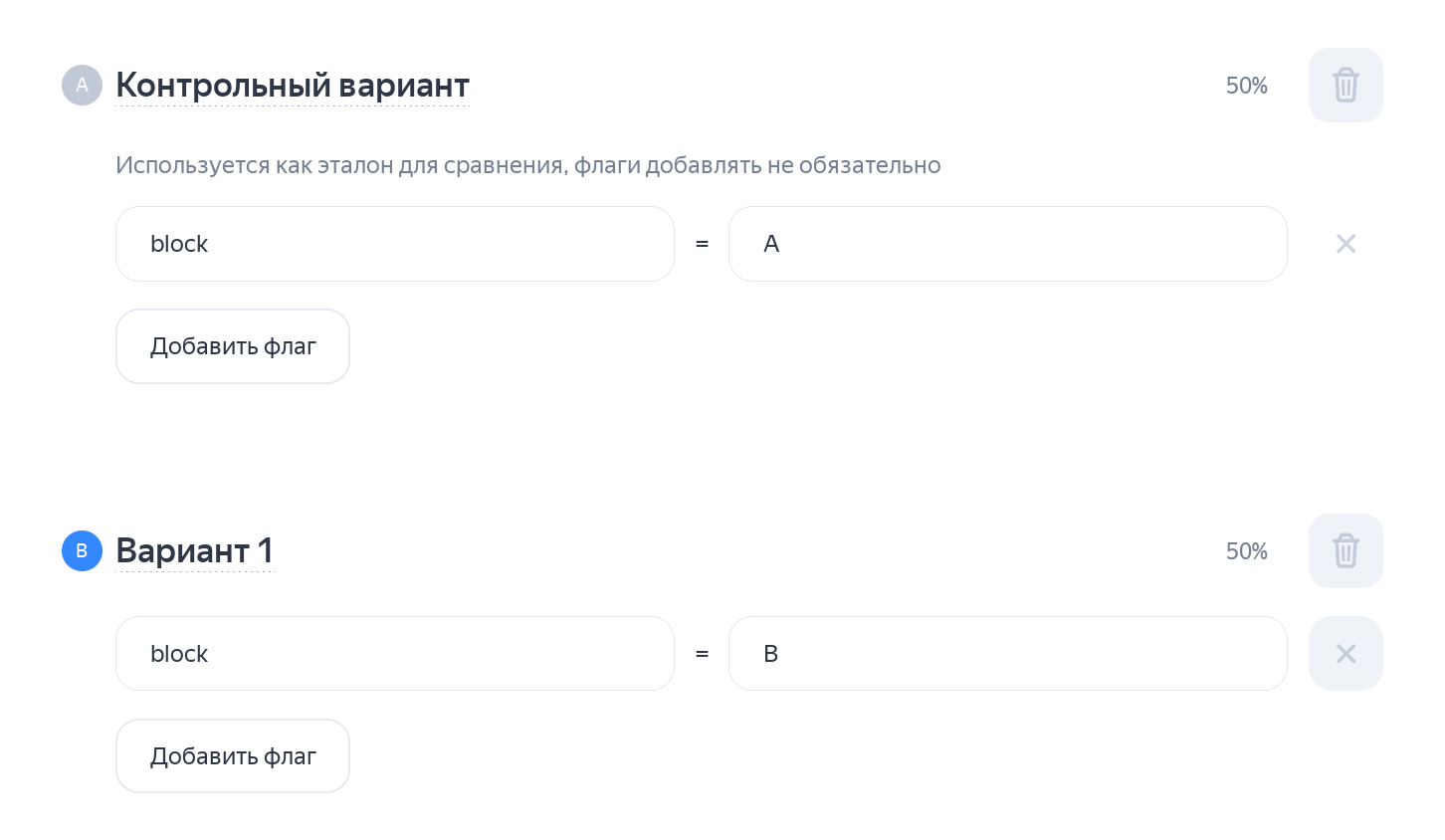 1. В Varioqub задайте имя флага и его значения. Например: имя флага block, значение в контрольном варианте — A, в Вариант 1B.