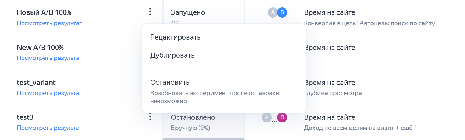 Длительность эксперимента можно задать от 1 до 90 дней. После достижения даты окончания эксперимент остановится автоматически. Вы можете остановить его вручную в любой момент: