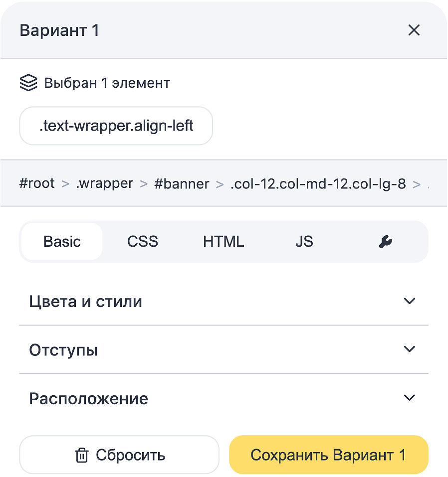 Если на нескольких страницах сайта используется одинаковый элемент, отредактировать элемент можно на одной из страниц. Varioqub применит изменения к элементу на всех страницах, которые удовлетворяют URL-фильтру, при условии, что селектор у элемента на всех страницах один.