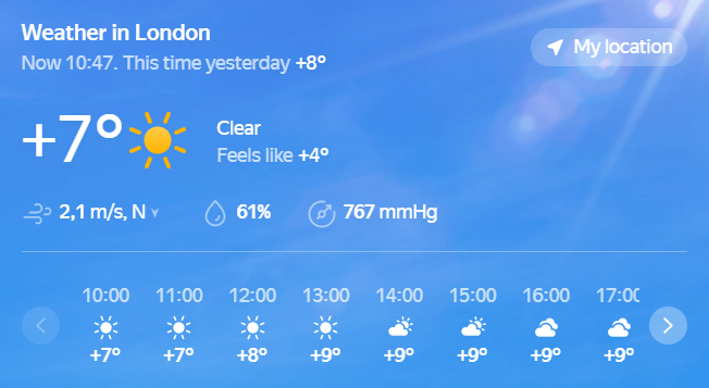 The service does not store weather history, but you can find out what the temperature was yesterday. You can see the yesterday's temperature in This time yesterday line that you can find in the weather card on the service homepage. The temperature is determined using the Meteum technology based on the data from the nearest weather stations.