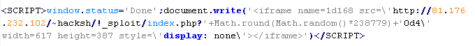 This verdict means that the site contains JavaScript code that loads a malicious .swf object which downloads exploits to website visitors. Typically, attackers place this code in a separate .js file on a compromised server.