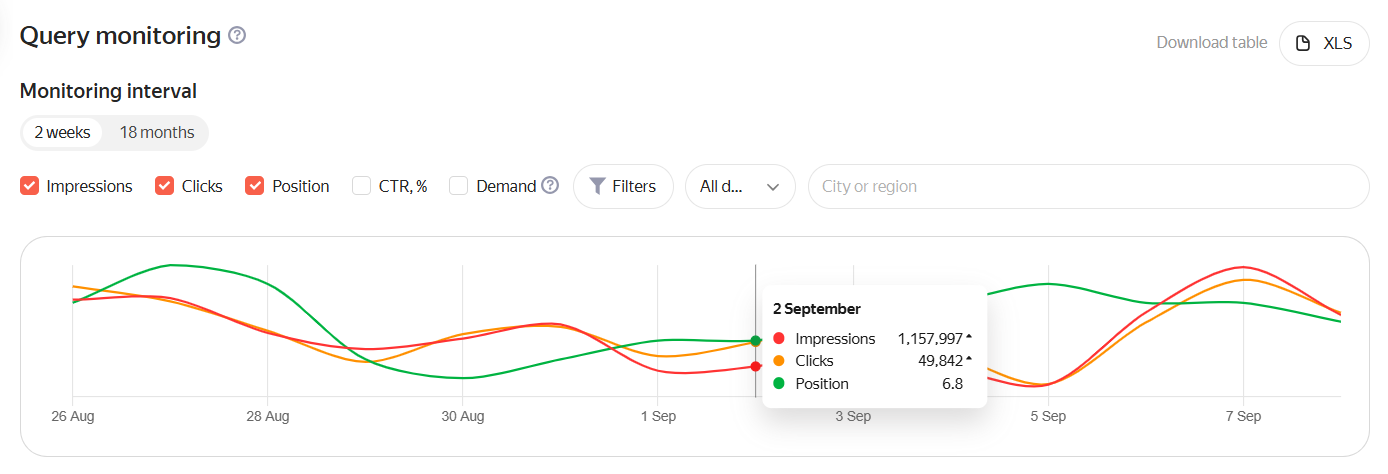 Shows how often Yandex users enter a search query. If the site appears on the first page more than once, the total number of the site’s impressions may exceed the demand. For example, for navigational queries where the user is looking for a specific site and the search engine shows several results from one site.