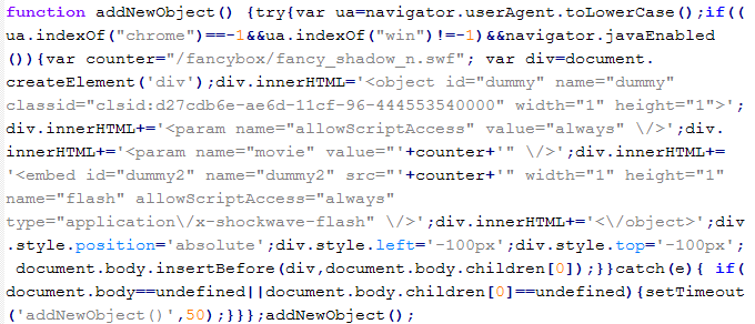 Bu karar, sitenin ziyaretçilere suistimal kodu indiren kötü amaçlı bir .swf nesnesi yükleyen JavaScript kodu içerdiği anlamına gelir. Genellikle saldırganlar bu kodu, ele geçirilmiş bir sunucuda ayrı bir .js dosyasına yerleştirirler.