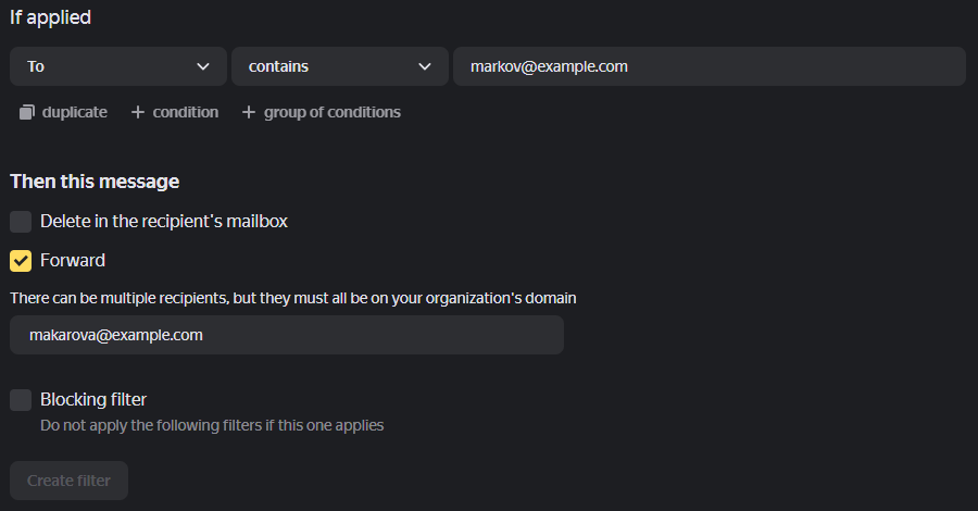 Example. An employee receives sales proposals from the company clients and messages from colleagues. While the employee is away, their responsibilities are divided between two people: one handles sales proposals, and the other replies to work emails. Create two filters: one will contain the option Blocking filter and forward sales proposals to the first person, and the other, which is lower on the list, will forward all messages to the second person. If a message contains a sales proposal, it won't be sent to the second colleague because the blocking filter is triggered.