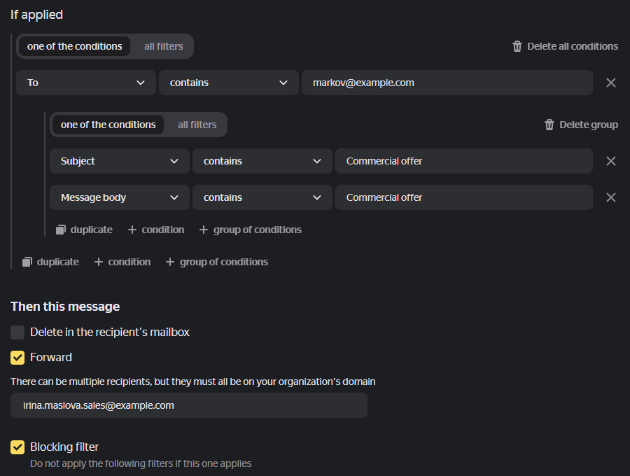 For example, an employee receives emails from colleagues and sales proposals from the company's clients. When they go to vacation, sales proposals need to be forwarded to another employee. When setting up the filter, add two conditions: the message must be sent to the absent employee's email, and its subject must contain the phrase "sales proposal".