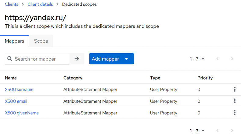 https://yandex.ru/-dedicated, and on the Mappers tab, create a new User Attribute Mapper For NameID (Add mapper – By configuration). -