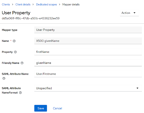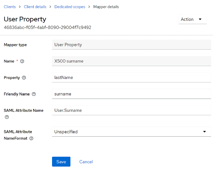Set up syncing of Keycloak and Yandex 360 attributes by opening each attribute and changing the value of SAML Attribute Name. The SAML Attribute Name values that are supported in Yandex 360 are listed below.