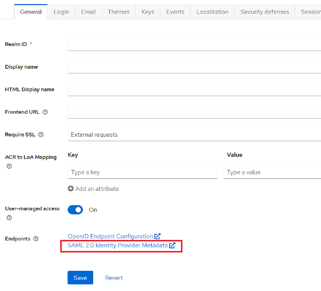 1. In the management console on the left panel, select Realm Settings and click SAML 2.0 Identity Provider Metadata.
