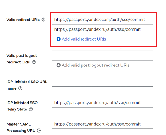 If your employees use Yandex 360 services not only on the Russian domain, add the URLs with language-specific domains as endpoints to the Valid Redirect URIs field.