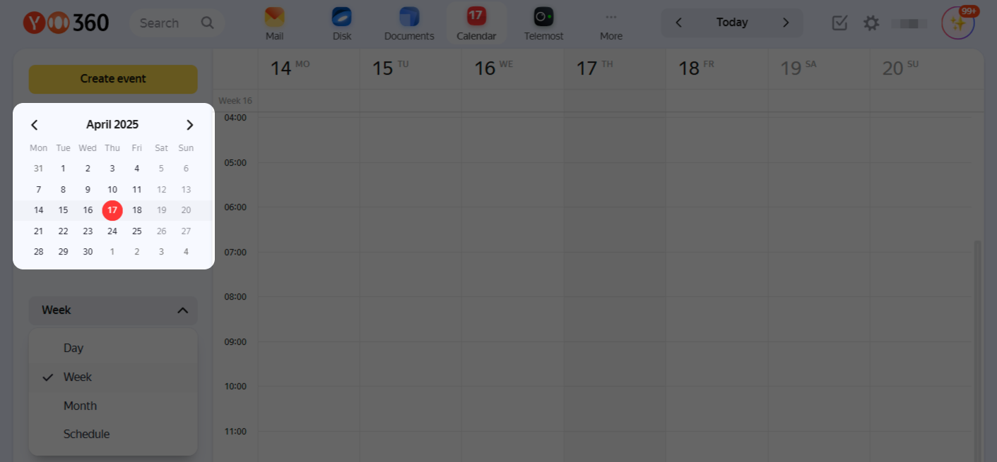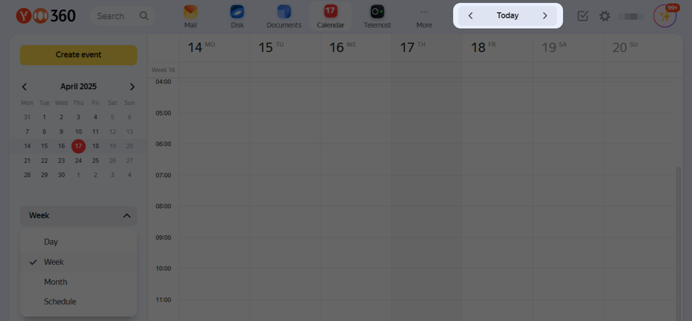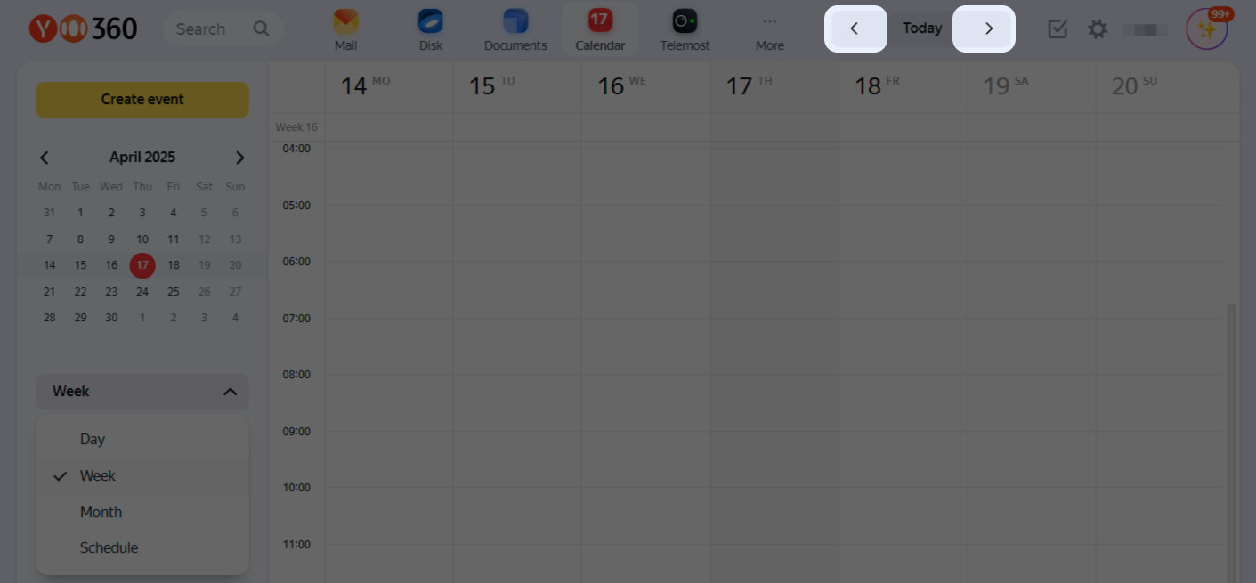 In Day view, you can switch between days using the buttons in the top panel. Use the same buttons to switch between weeks and months in Week and Month view respectively. You can also use your mouse wheel to scroll through months in Month view. In Schedule view, you can scroll down with the mouse wheel or the scroll bar.