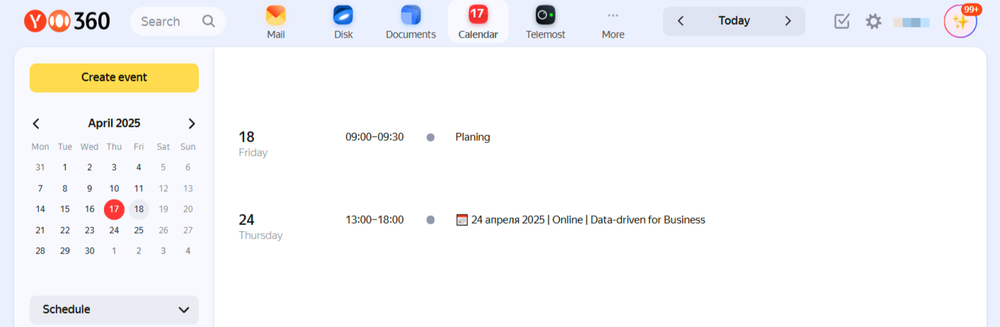Any Yandex Calendar user can share their calendar with you. You'll see all the existing and new events, as well as any changes that user makes. If the user allows you to edit the calendar, you'll be able to make changes and invite other people to meetings.