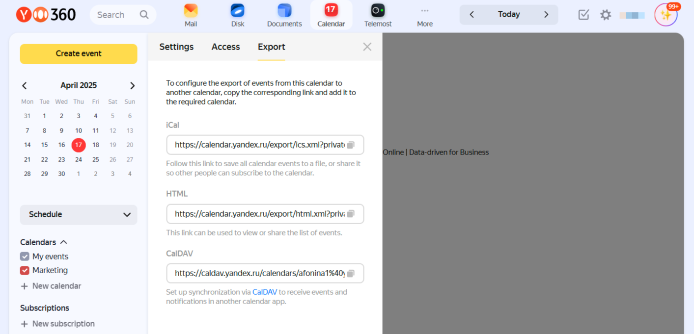 You can export events from Yandex Calendar and import them to a calendar embedded on another website or share events from your calendar with others by sending them a file or a link.