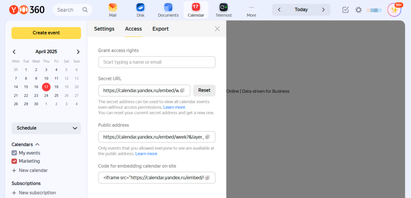 If the visibility option for some events in your calendar is set to Participants or Organization, such events will be visible only to their participants or only to the employees of your organization. If you want to share all your events, copy the link from the Secret URL field.