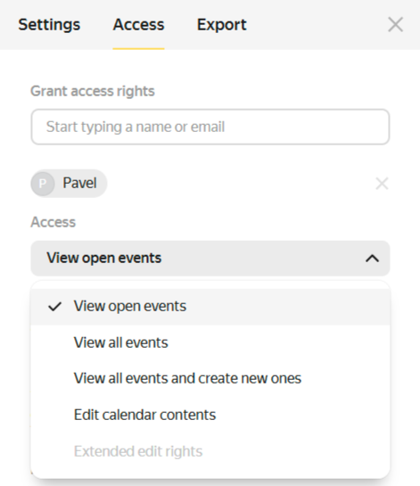 In the Access section, start typing the name or email address in the Grant access rights field and Yandex Calendar will show suggestions from your contacts.
