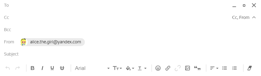 If you want to send email from your address hosted on another service (for example, Gmail or Mail.ru), add this address on the Email addresses page and verify your access. After confirmation, you will be able to choose either your Yandex address alias or your mailbox address on another service in the From field.