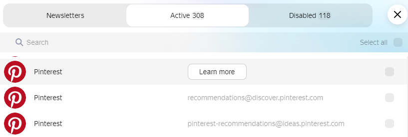 - On the Active tab, select the subscriptions you want to hide. New email from these addresses will be automatically sent to the Trash folder.