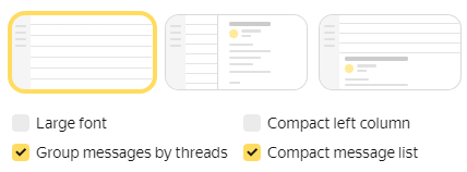 By default, Yandex Mail uses a two-panel interface. The message preview is displayed on a separate page to the right from the list of folders. You can also view a message in a list of messages, which will make it appear over the list.